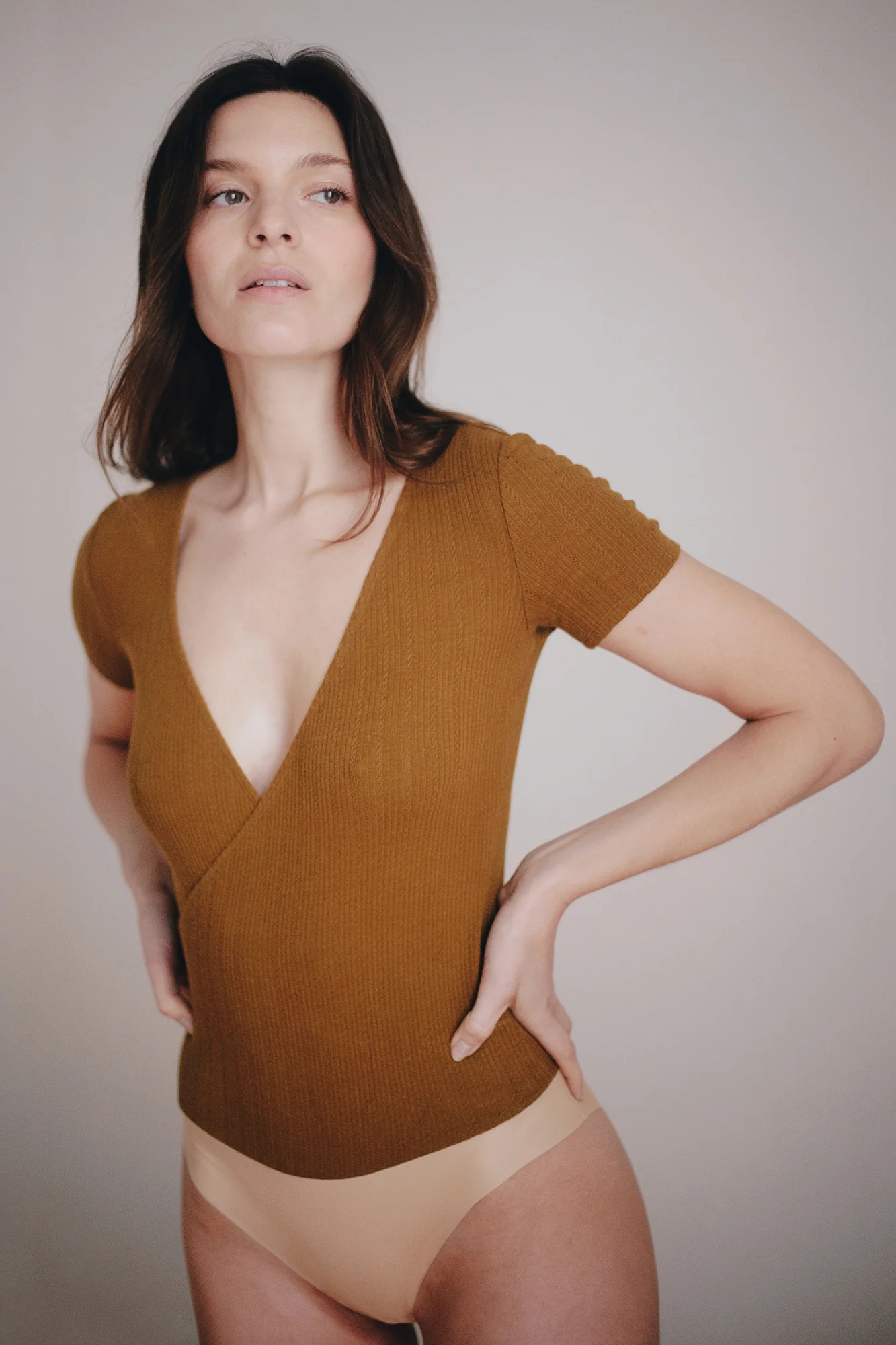 Notre body cache-cœur que vous aimez tant est de retour ! Une coupe près du corps, un décolleté en V sexy juste ce qu'il faut et des manches courtes : c'est la recette parfaite d'un body qui sublime toutes les morphologies. Et comme sur tous nos bodys, la partie culotte est en microfibre et sans couture : invisibilité garantie sous tous vos bas !