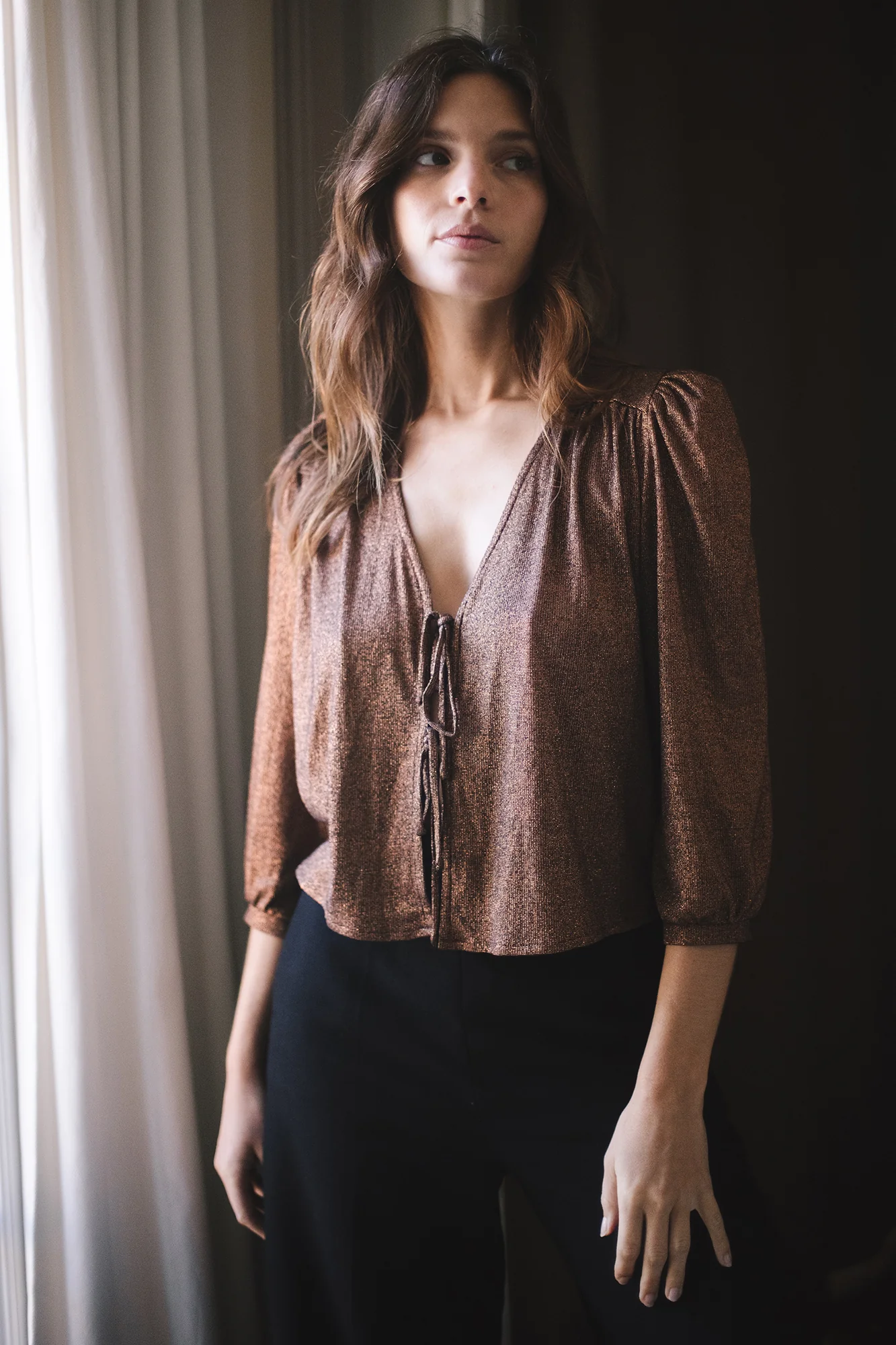 Le top Gina en version lurex sera la pièce idéale pour les fêtes : un décolleté V profond sensuel et féminin fermé par deux liens à nouer, un lurex coloris bronze souple et fluide, des manches 3/4 avec un léger volume aux épaules. Portez-le différemment selon vos envies : à même la peau, au-dessus d'un body, sous une veste ou un gilet sans manche pour le réchauffer.